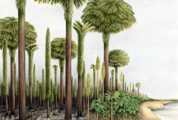 Reconstruction of early Westphalian lycopsid-dominated coal swamp in tropical Euramerica. Artwork by Annette Townsend.